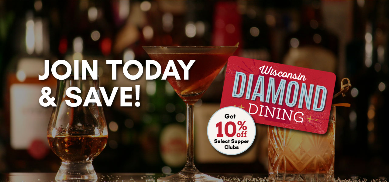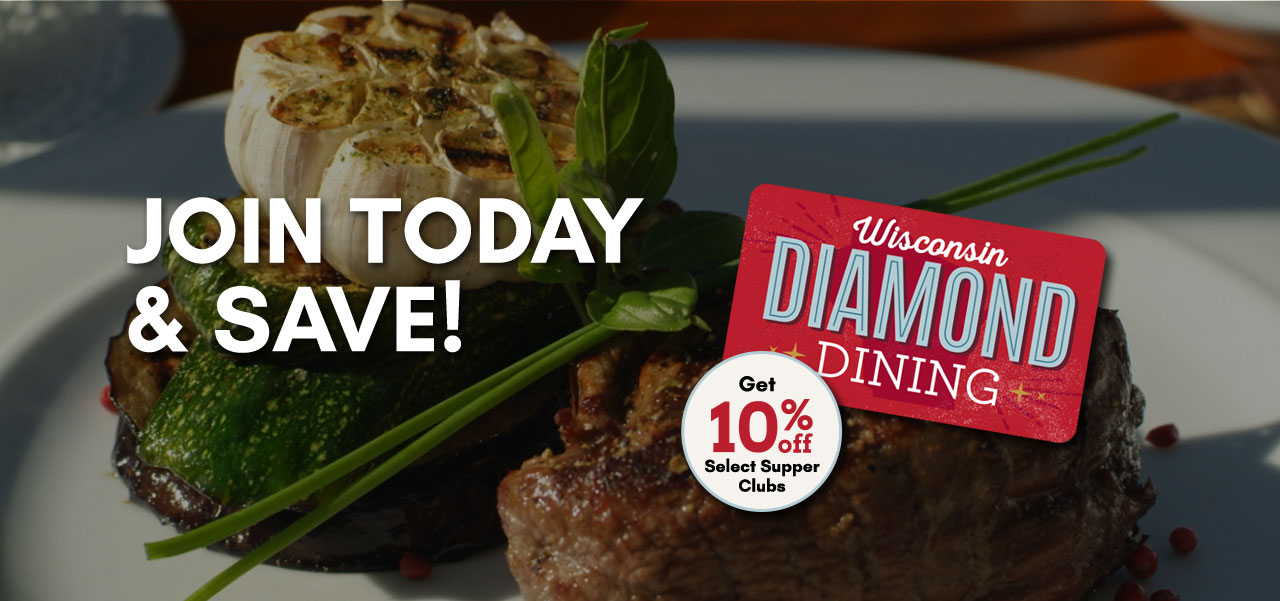 Welcome to the Wisconsin Diamond Dining Club! We offer a inexpensive discount card to be used for a 12% discount at many Wisconsin Supper Clubs. This website will allow you to sign up for the card and search for the participating supper clubs near you. We will continue to add more supper clubs, their phone number, days and hours of operation and eventually pictures of them as we grow.
